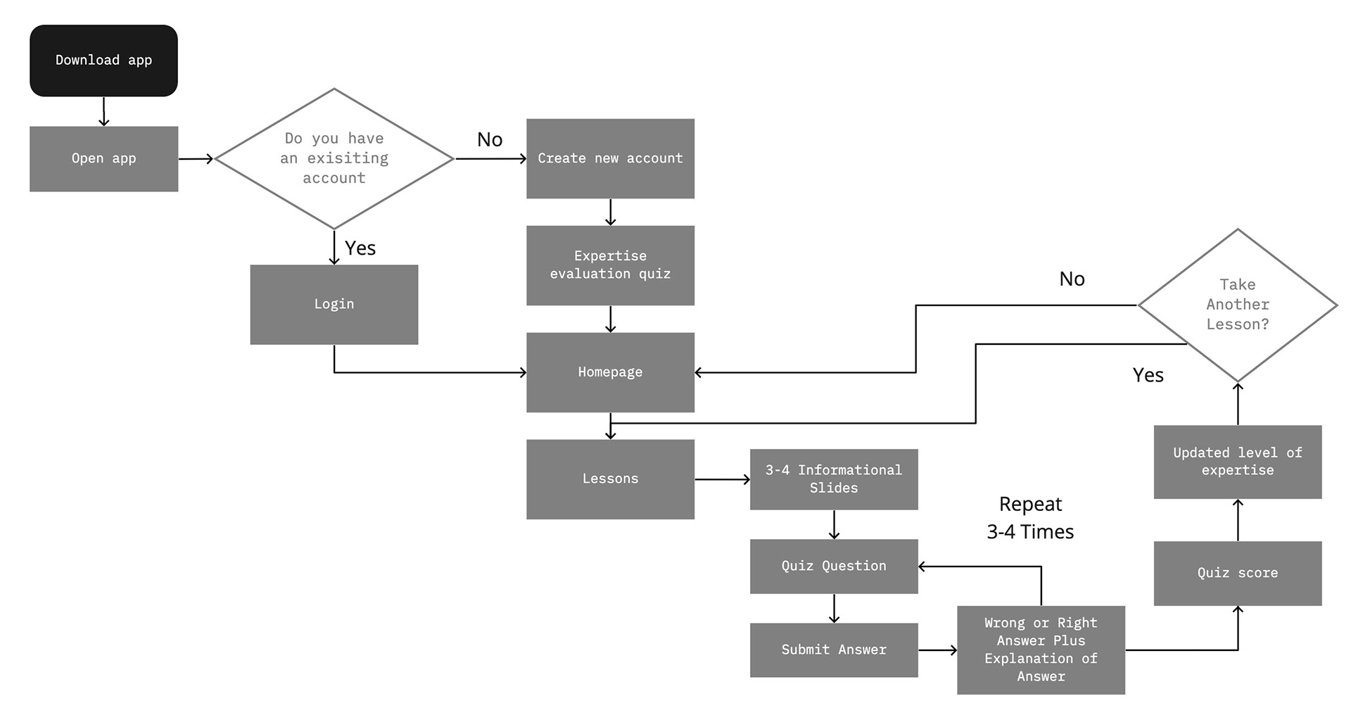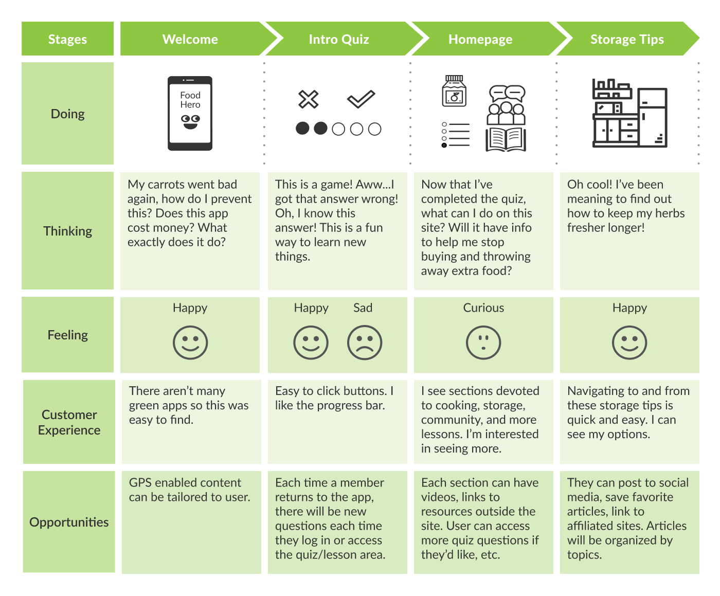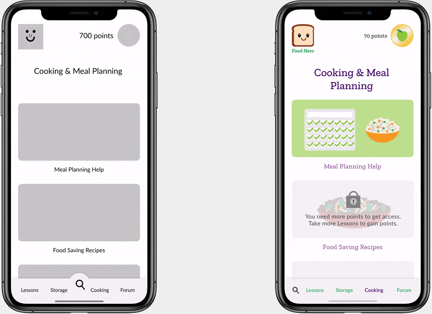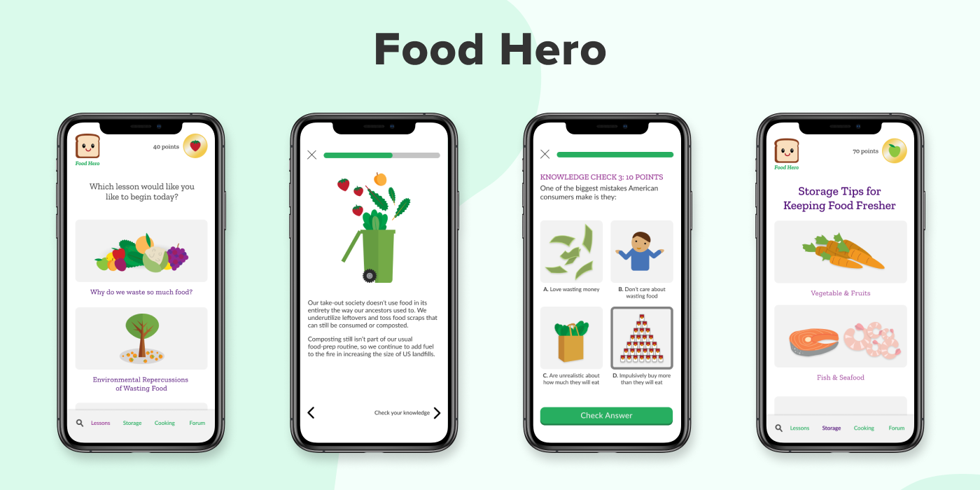 Because we were creating an entirely new app, we thought about the experiences Bella would have while using it. She creates an account and moves immediately into a food sustainability quiz. She’s excited by the quiz that feels like a game. At the end of the game, she’s interested to learn more and goes into a lesson. After the lesson, there are a few questions waiting for her to recap what she has learned and review the important points. After taking a lesson she can head to the homepage where she can learn about meal planning to reduce food waste, how to store food, and finds a forum where she learns from other users.