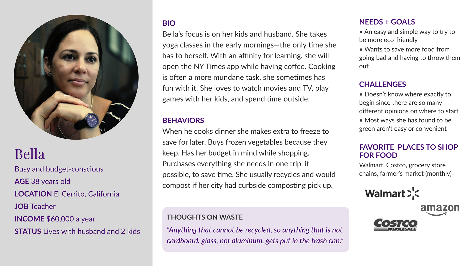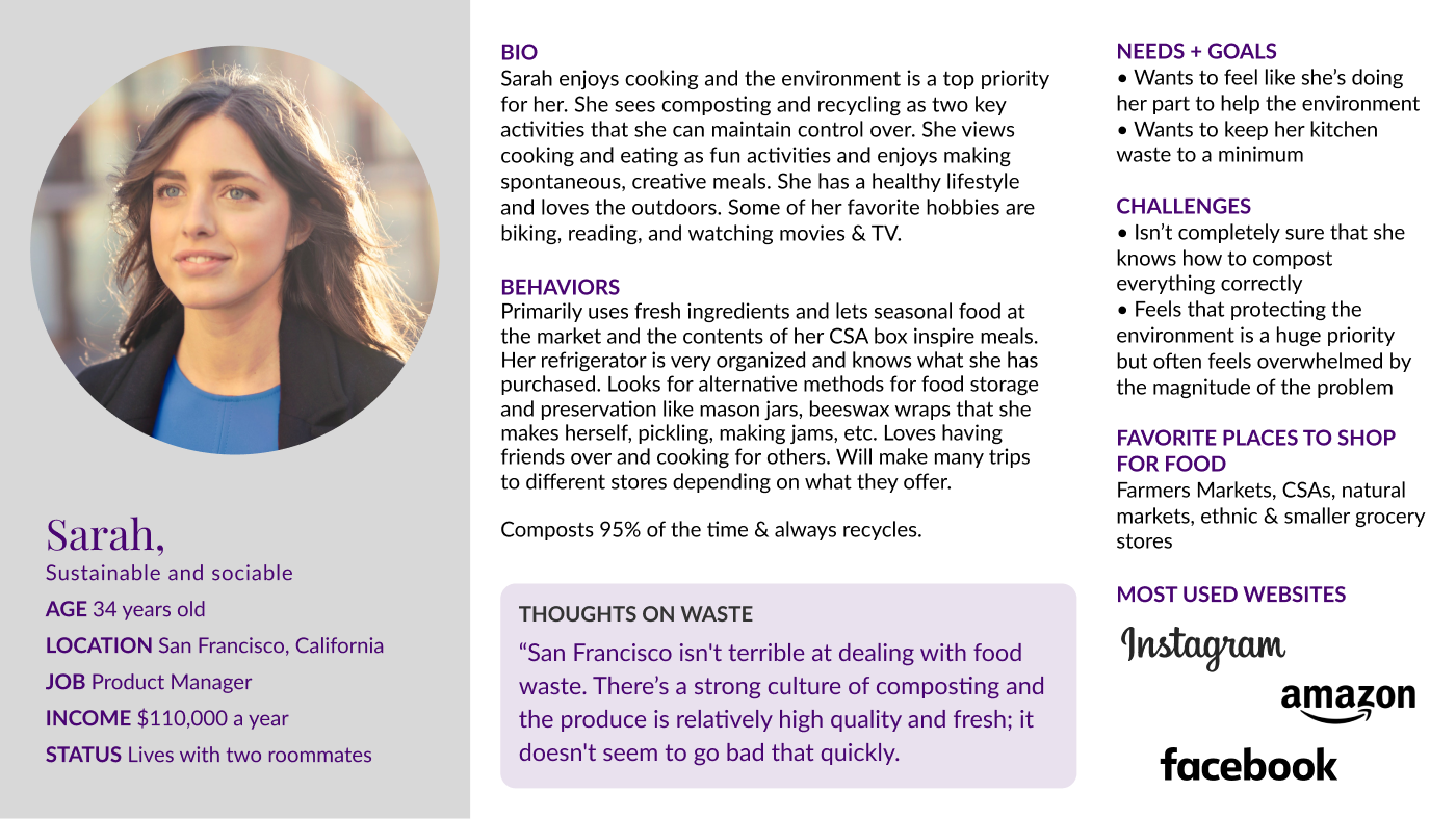 Once we found our primary user we stepped back to review our interviews to ensure that our solution addressed the true problem. We realized that the problem wasn’t that those people needed to find ways to compost more easily. What they really needed was the knowledge to cut down dramatically on the food they bought but ended up throwing away. We knew now that we needed to find a way to quickly educate busy people like our primary user, Bella.
