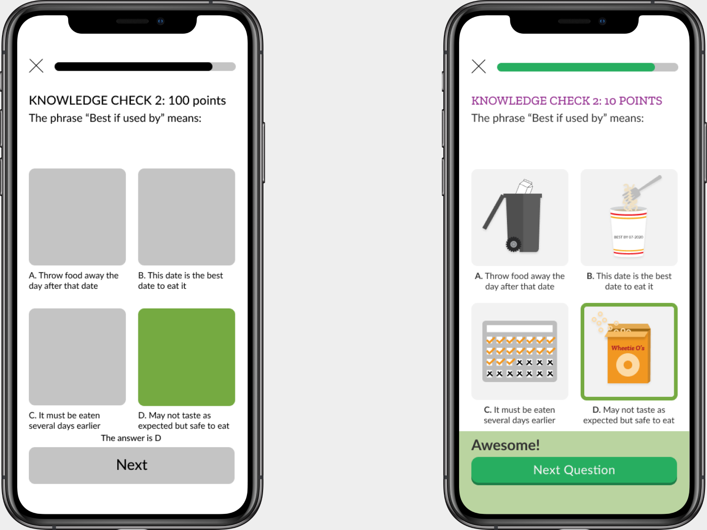 Testers seemed to want more clarity about correct or incorrect answers. To address this, we made it very clear in our next iteration by adding more fun responses and a green box to indicate correct answers.