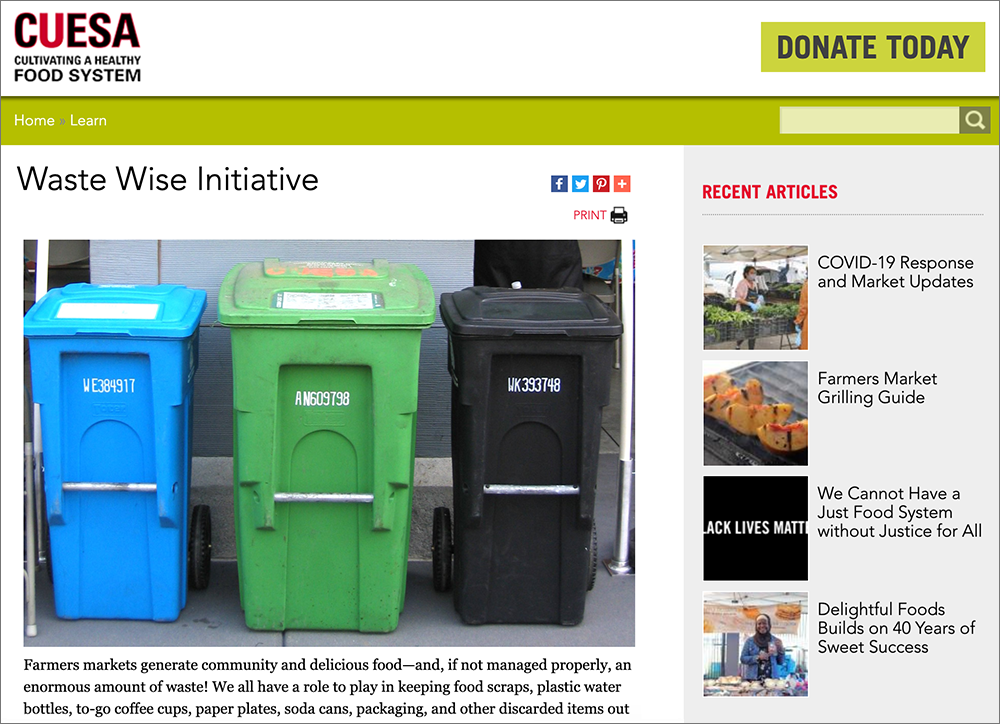 CUESA (Center for Urban Education and Sustainable Agriculture) is dedicated to growing thriving communities through the power and joy of local food. One critical part of cultivating a healthy food system involves the reduction of food waste. The USDA estimates that 133 billion pounds of food are thrown away each year. The CUESA website has a small section dedicated to tips and resources on reducing food waste but it’s not engaging nor motivating.